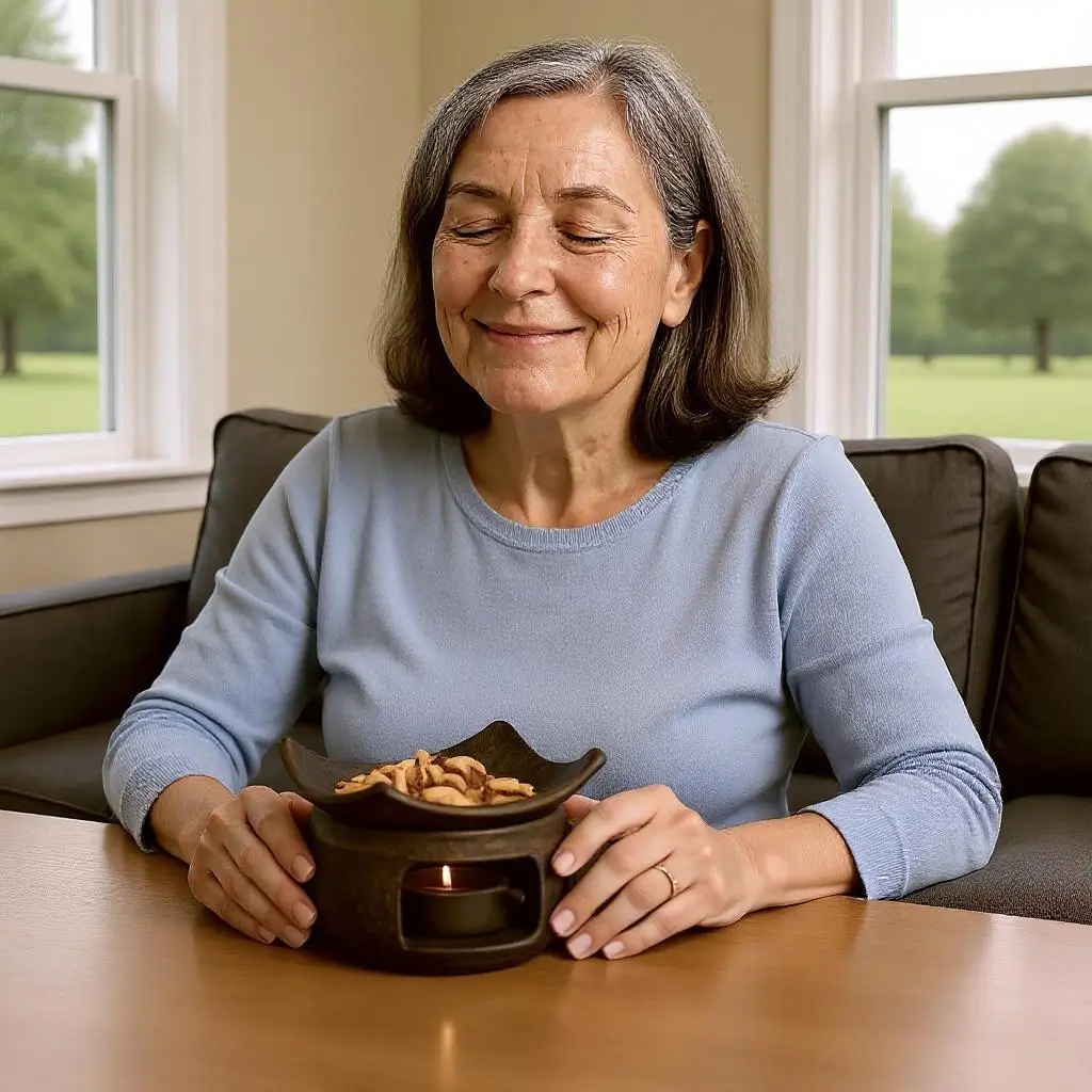 Place a small amount of dried botanicals—like cedar chips, citrus peel, rose petals, rosemary or coffee beans—on the ceramic plate and light the candle beneath. Gentle heat warms and releases the botanicals’ natural aromas, creating an inviting scent without airborne sprays or synthetic oils. Sessions are typically used for about 30–40 minutes, then the plate is left to cool before cleaning.